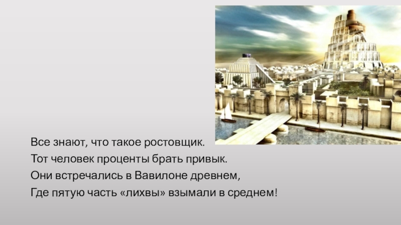 Все знают, что такое ростовщик.Тот человек проценты брать привык.Они встречались в Вавилоне древнем,Где пятую часть «лихвы» взымали