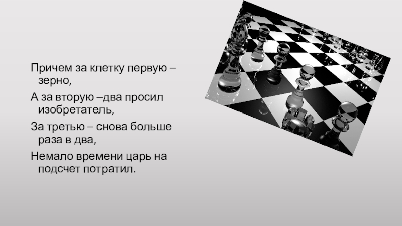 Причем за клетку первую – зерно,А за вторую –два просил изобретатель,За третью – снова больше раза в