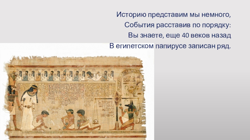 Историю представим мы немного, События расставив по порядку:Вы знаете, еще 40 веков назадВ египетском папирусе записан ряд.