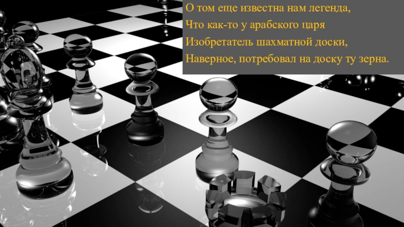 О том еще известна нам легенда,Что как-то у арабского царяИзобретатель шахматной доски,Наверное, потребовал на доску ту зерна.