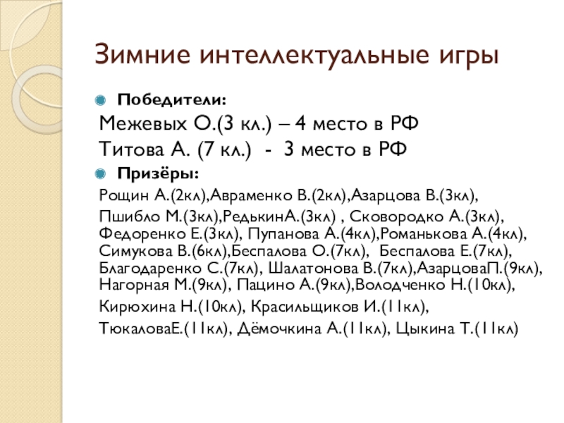 Пшибло М.(3кл),РедькинА.(3кл) , Сковородко А.(3кл), Федоренко Е.(3кл), Пупанова А.(4кл),Романькова А.(4кл), Симукова В.(6кл),Беспалова О.(7кл), Беспалова Е.(7кл), Благодаренко С.(7кл), Шалатонова В.(7кл),АзарцоваП.(9кл), Нагорная М.(9кл), Пацино А.(9кл),Володченко Н.(10кл),