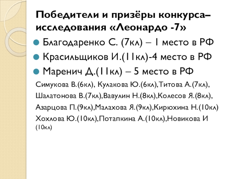 Слайд 8Победители и призёры конкурса– исследования «Леонардо -7»