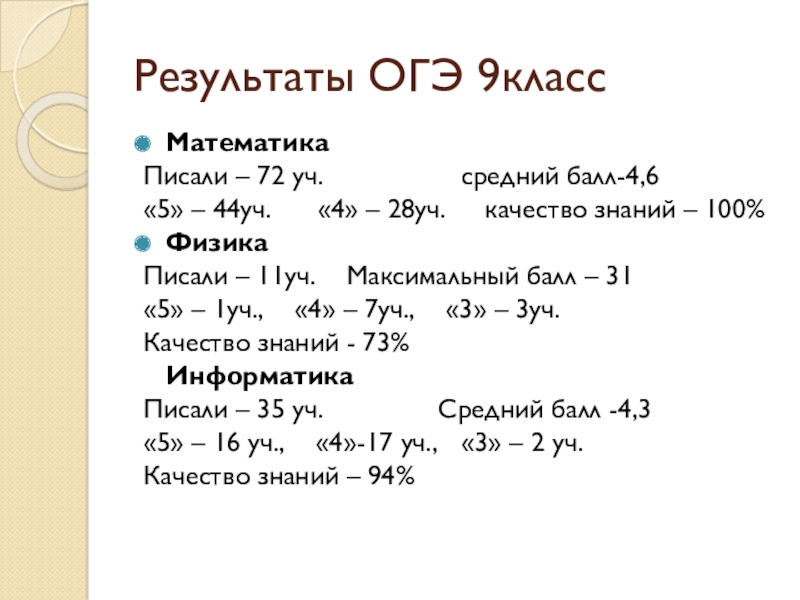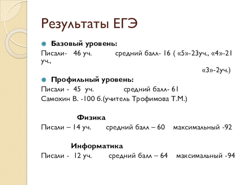 Писали - 12 уч. средний балл – 64 максимальный -94