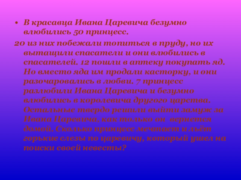 топиться в пруду, но их вытащили спасатели и они влюбились в спасателей. 12 пошли в аптеку покупать яд. Но вместо яда им продали касторку, и они разочаровались в любви. 7 принцесс разлюбили Ивана Царевича и безумно влюбились в королевича другого царства. Остальные твердо решили выйти замуж за Ивана Царевича, как только он вернется домой. Сколько принцесс мечтает и льёт горькие слезы по царевичу, который ушел на поиски своей невесты?