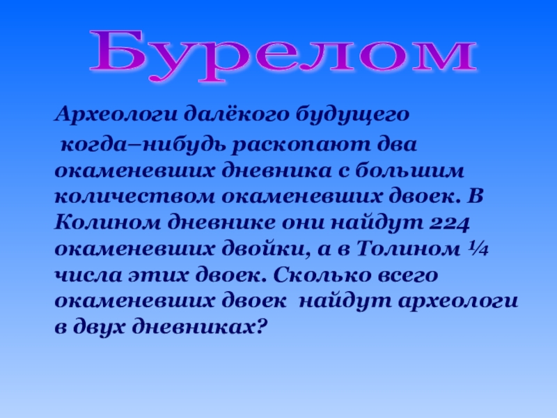 дневника с большим количеством окаменевших двоек. В Колином дневнике они найдут 224 окаменевших двойки, а в Толином ¼ числа этих двоек. Сколько всего окаменевших двоек найдут археологи в двух дневниках?
