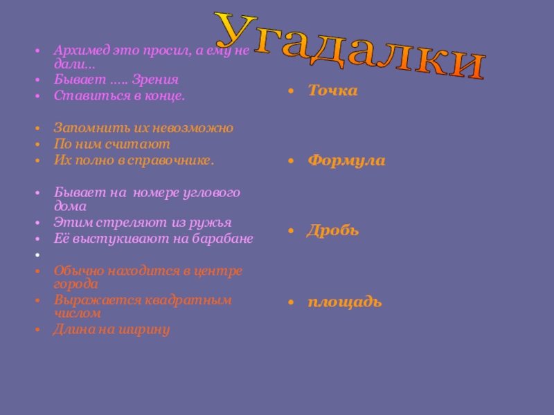Архимед это просил, а ему не дали…Бывает ….. ЗренияСтавиться в конце.Запомнить их невозможноПо ним считаютИх полно в