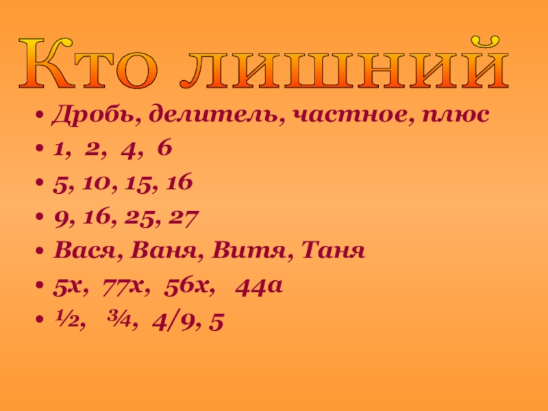 Дробь, делитель, частное, плюс1, 2, 4, 65, 10, 15, 169, 16, 25, 27Вася, Ваня, Витя, Таня5х, 77х,
