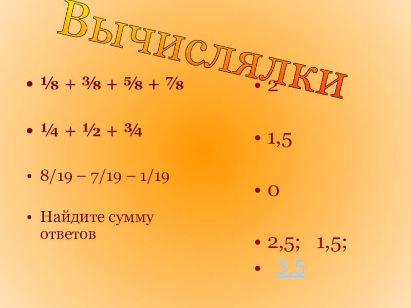 ⅛ + ⅜ + ⅝ + ⅞¼ + ½ + ¾8/19 – 7/19 – 1/19Найдите сумму ответов21,502,5;