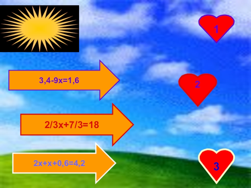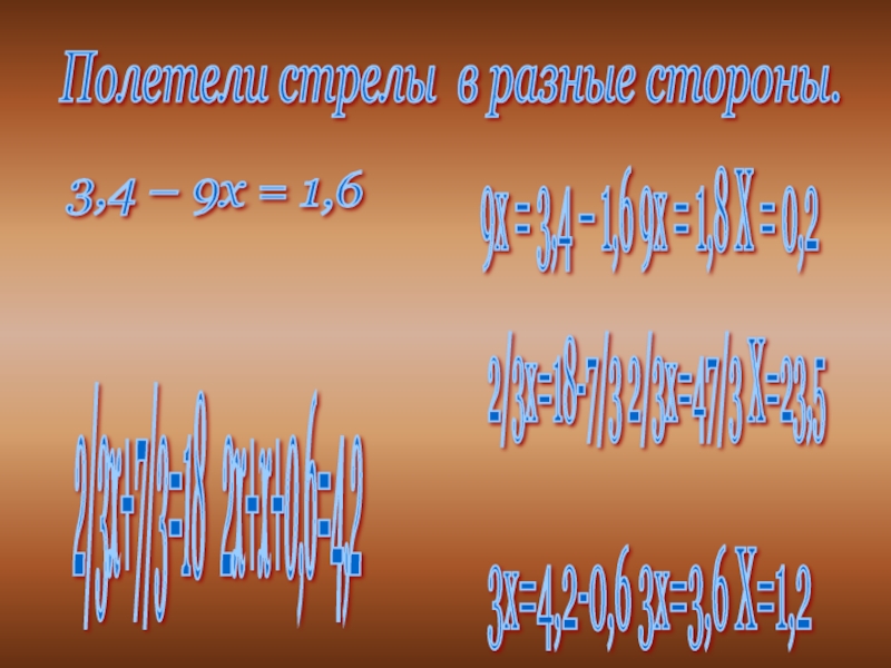 3,4 – 9х = 1,6 2/3х+7/3=18  2х+х+0,6=4,2 Полетели стрелы в разные стороны. 9х = 3,4 –