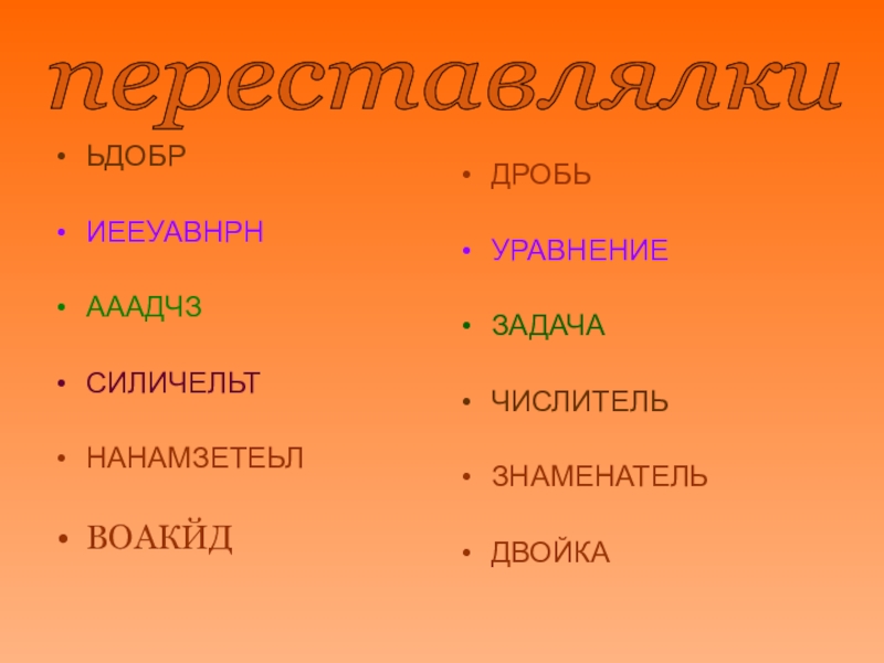 ЬДОБРИЕЕУАВНРНАААДЧЗСИЛИЧЕЛЬТНАНАМЗЕТЕЬЛВОАКЙДДРОБЬУРАВНЕНИЕЗАДАЧАЧИСЛИТЕЛЬЗНАМЕНАТЕЛЬДВОЙКАпереставлялки