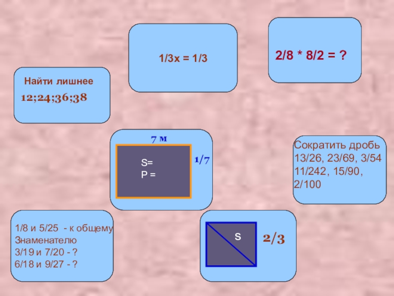 7 м 2/8 * 8/2 = ?S= P =1/7s2/312;24;36;38Найти лишнее1/3х = 1/31/8 и 5/25 - к общемуЗнаменателю3/19
