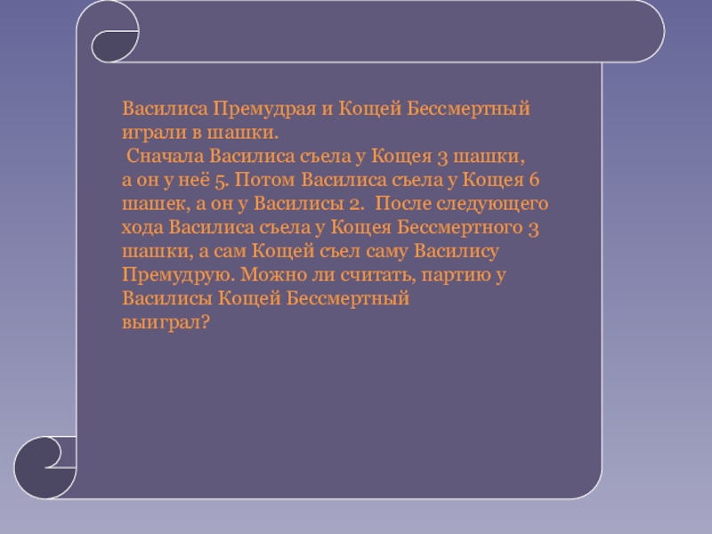 Василиса Премудрая и Кощей Бессмертный играли в шашки. Сначала Василиса съела у Кощея 3 шашки,а он