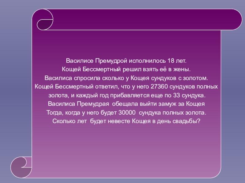 Василисе Премудрой исполнилось 18 лет.Кощей Бессмертный решил взять её в жены.Василиса спросила сколько у Кощея сундуков с
