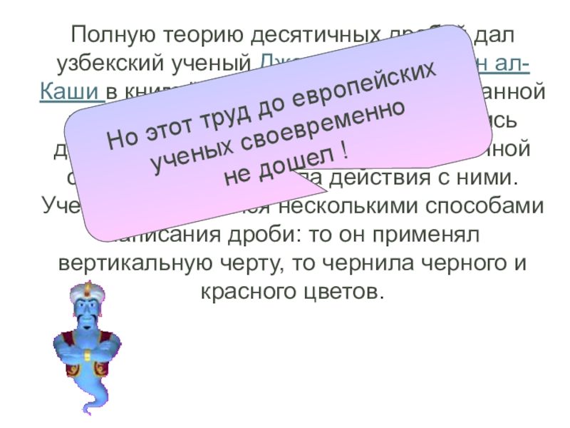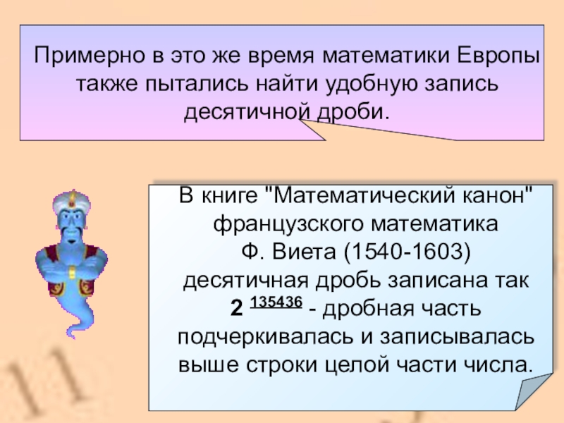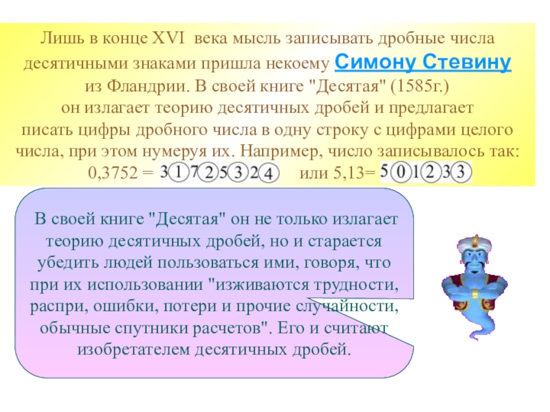 Лишь в конце XVI века мысль записывать дробные числа десятичными знаками пришла некоему Симону Стевину