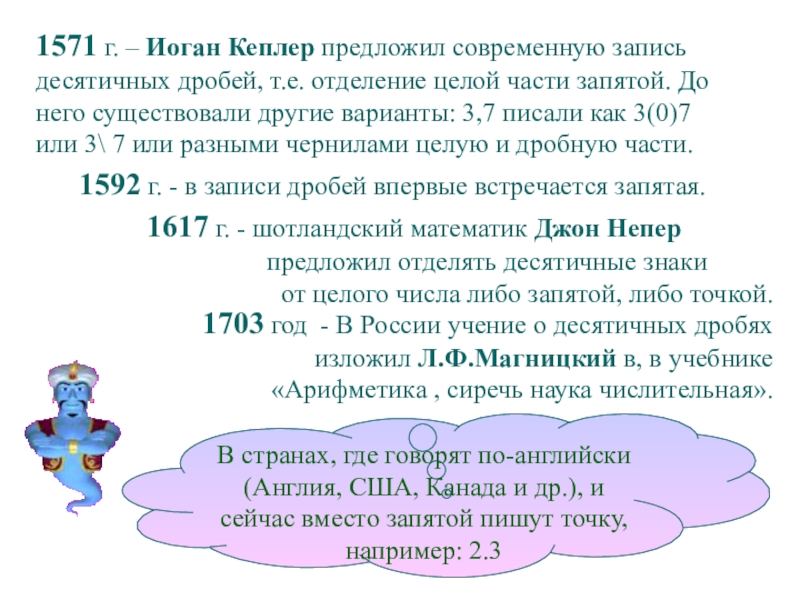 1571 г. – Иоган Кеплер предложил современную запись десятичных дробей, т.е. отделение целой части запятой. До него существовали другие варианты: 3,7 писали как 3(0)7 или 3\ 7 или разными чернилами целую и дробную части.