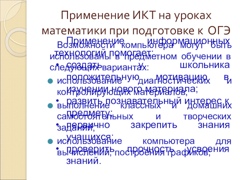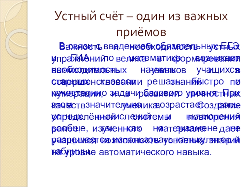 В связи с введением обязательных ЕГЭ и ГИА по математике возникает необходимость научить учащихся старших классов решать быстро и качественно задачи базового уровня. При этом значительно возрастает роль устных вычислений и вычислений вообще, так как на экзамене не разрешается использовать калькулятор и таблицы.