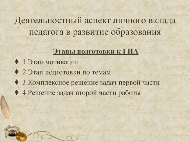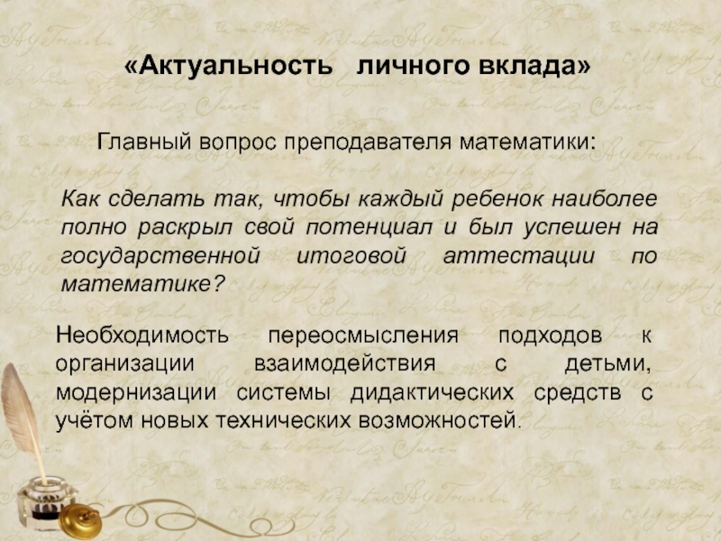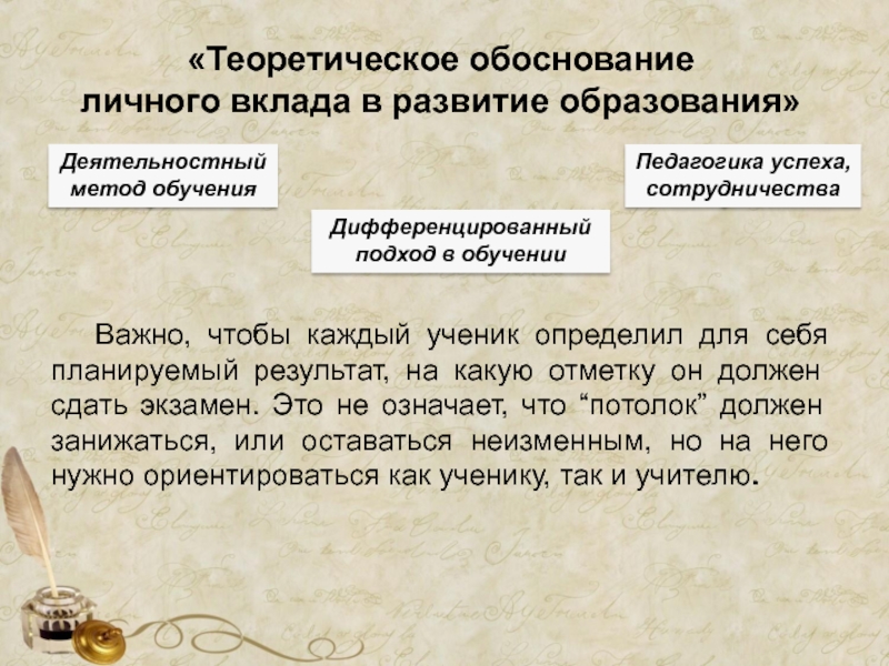 Важно, чтобы каждый ученик определил для себя планируемый результат, на какую отметку он должен сдать экзамен. Это не означает, что “потолок” должен занижаться, или оставаться неизменным, но на него нужно ориентироваться как ученику, так и учителю.