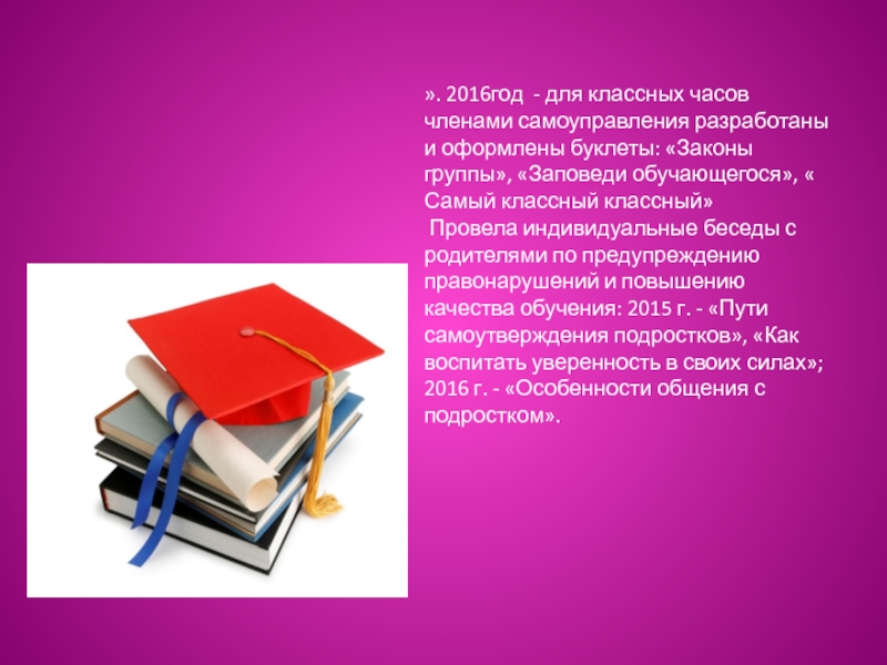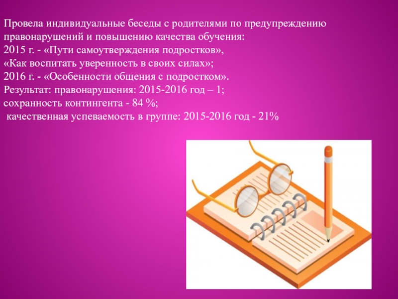 Провела индивидуальные беседы с родителями по предупреждению правонарушений и повышению качества обучения: 2015 г. - «Пути самоутверждения подростков», «Как воспитать уверенность в своих силах»; 2016 г. - «Особенности общения с подростком».