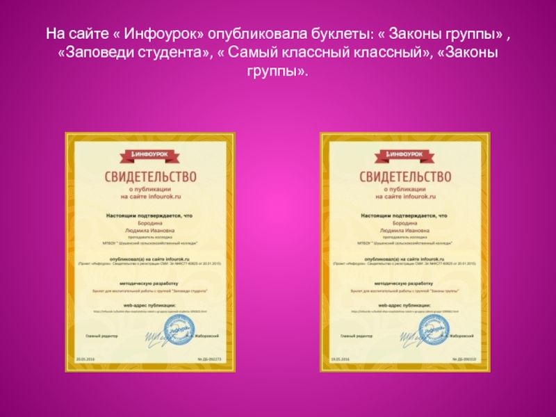 Слайд 19На сайте « Инфоурок» опубликовала буклеты: « Законы группы» , «Заповеди