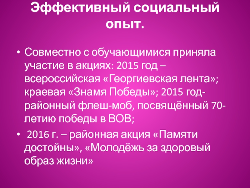 – всероссийская «Георгиевская лента»; краевая «Знамя Победы»; 2015 год- районный флеш-моб, посвящённый 70-летию победы в ВОВ;