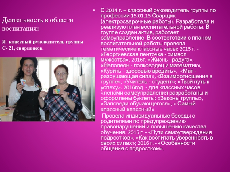 г. – классный руководитель группы по профессии 15.01.15 Сварщик (электросварочные работы). Разработала и реализую план воспитательной работы. В группе создан актив, работает самоуправление. В соответствии с планом воспитательной работы провела тематические классные часы: 2015 г. - «Георгиевская ленточка - символ мужества», 2016г.-«Жизнь - радуга», «Наполеон - полководец и математик», «Курить - здоровью вредить», «Мат - разрушающая сила», «Взаимоотношения в группе», «Учитель - студент»; «Твой путь к успеху». 2016год - для классных часов членами самоуправления разработаны и оформлены буклеты: «Законы группы», «Заповеди обучающегося», « Самый классный классный»