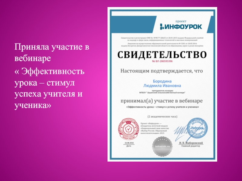 Слайд 20Приняла участие в вебинаре
