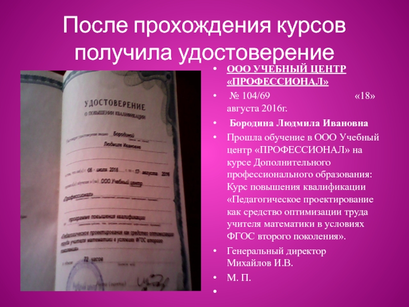 Слайд 24После прохождения курсов получила удостоверение