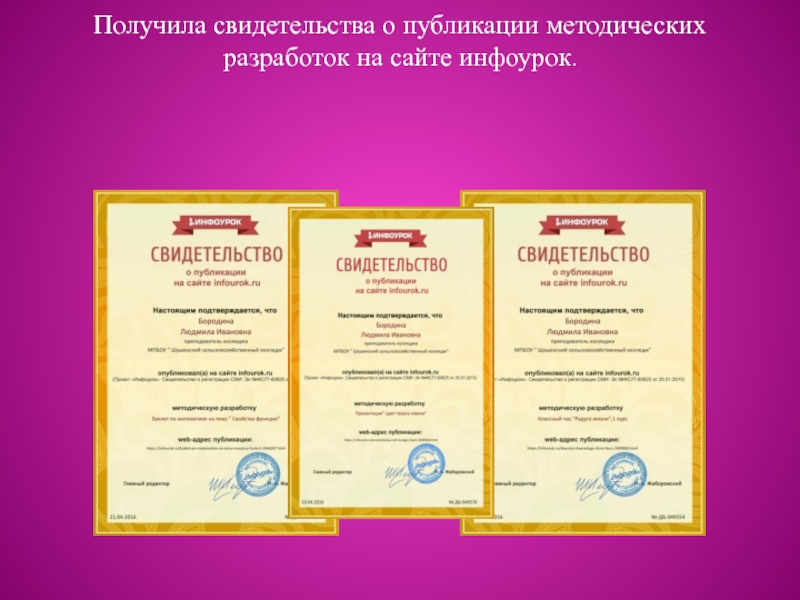 Слайд 18Получила свидетельства о публикации методических разработок на сайте инфоурок.