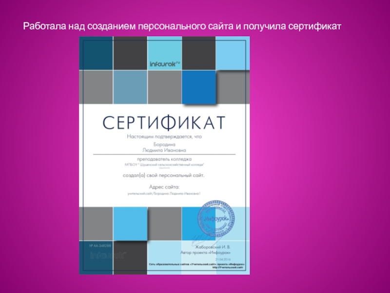 Слайд 16Работала над созданием персонального сайта и получила сертификат
