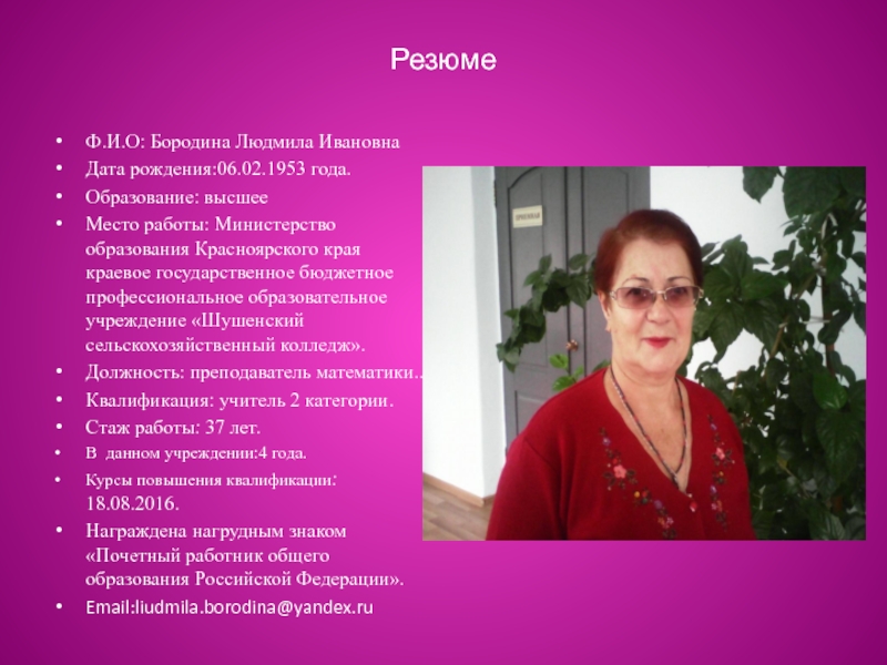 Ф.И.О: Бородина Людмила Ивановна