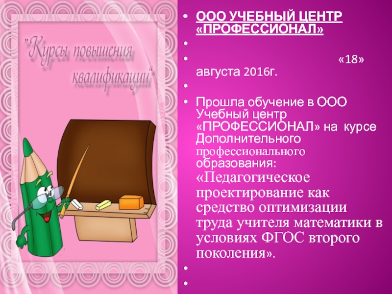Прошла обучение в ООО Учебный центр «ПРОФЕССИОНАЛ» на курсе Дополнительного профессионального образования: Курс повышения квалификации «Педагогическое проектирование как средство оптимизации труда учителя математики в условиях ФГОС второго поколения».