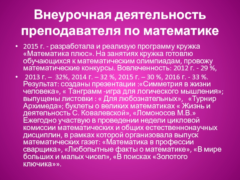 кружка «Математика плюс». На занятиях кружка готовлю обучающихся к математическим олимпиадам, провожу математические конкурсы. Вовлеченность: 2012 г. - 29 %,