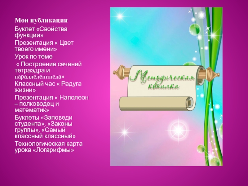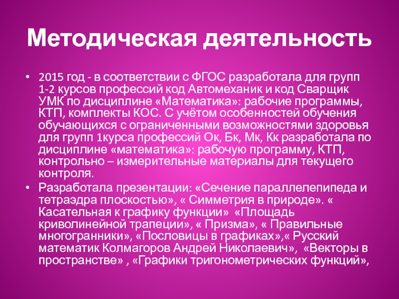 Разработала презентации: «Сечение параллелепипеда и тетраэдра плоскостью», « Симметрия в природе». « Касательная к графику функции» «Площадь криволинейной трапеции», « Призма», « Правильные многогранники», «Пословицы в графиках»,« Русский математик Колмагоров Андрей Николаевич», «Векторы в пространстве» , «Графики тригонометрических функций»,