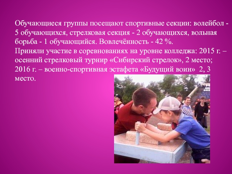 Слайд 12Обучающиеся группы посещают спортивные секции: волейбол - 5 обучающихся, стрелковая секция