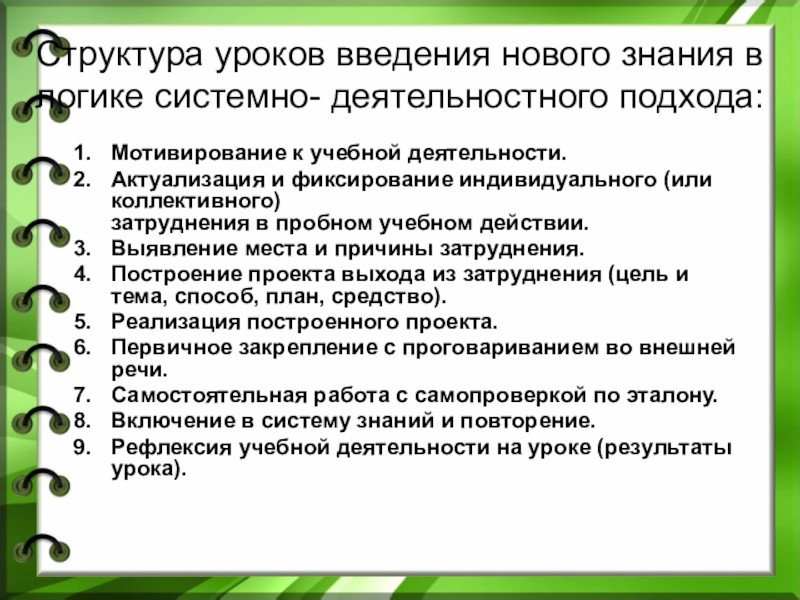 Структура уроков введения нового знания в логике системно- деятельностного подхода:Мотивирование к учебной деятельности.Актуализация и фиксирование индивидуального (или