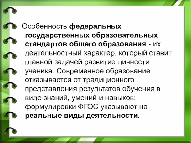 характер, который ставит главной задачей развитие личности ученика. Современное образование отказывается от традиционного представления результатов обучения в виде знаний, умений и навыков; формулировки ФГОС указывают на реальные виды деятельности.
