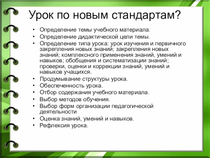 Урок по новым стандартам?Определение темы учебного материала. Определение дидактической цели темы. Определение типа урока: урок изучения и