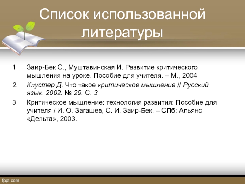 Критическое мышление: технология развития: Пособие для учителя / И. О. Загашев, С. И. Заир-Бек. – СПб: Альянс «Дельта», 2003.
