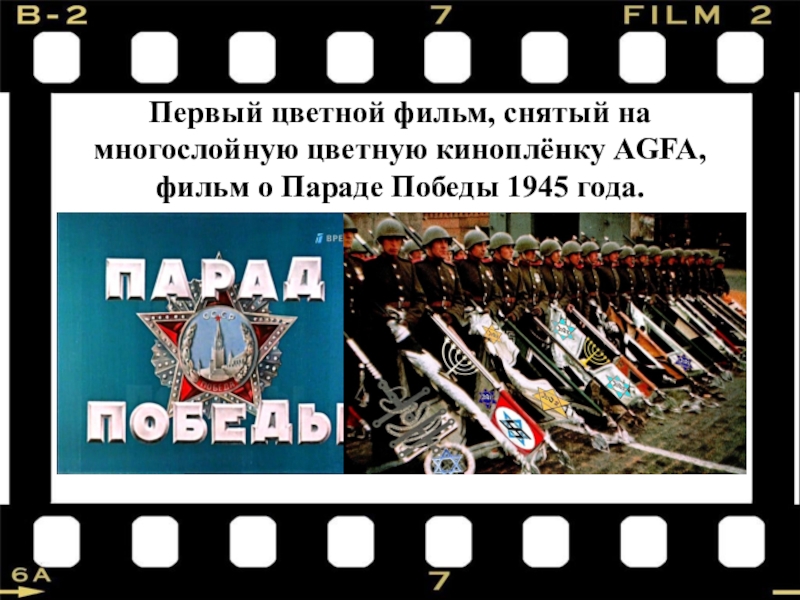 Первый цветной фильм, снятый на многослойную цветную киноплёнку AGFA, фильм о Параде Победы 1945 года.