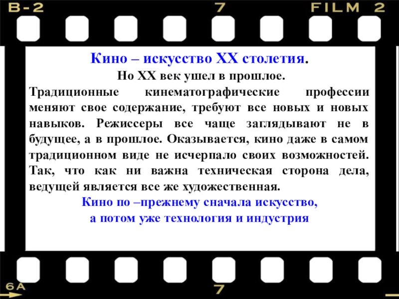 Кино – искусство XX столетия. Но XX век ушел в прошлое.Традиционные кинематографические профессии меняют свое содержание, требуют