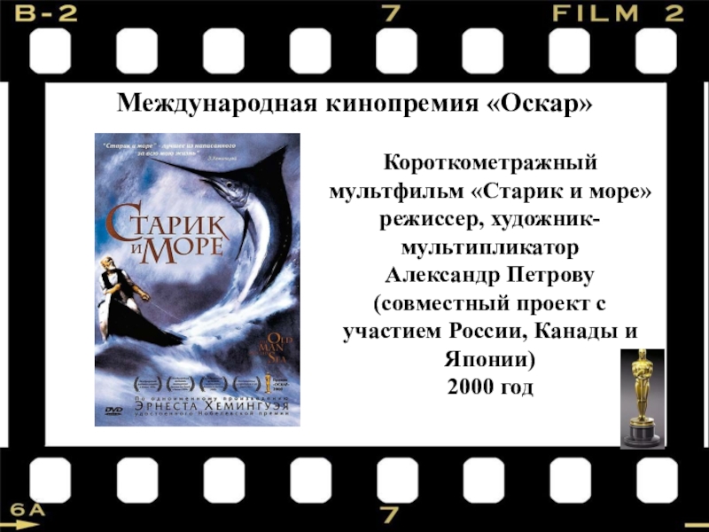 Международная кинопремия «Оскар»Короткометражный мультфильм «Старик и море» режиссер, художник-мультипликаторАлександр Петрову(совместный проект с участием России, Канады и Японии)2000