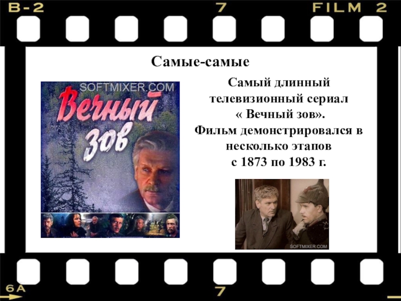 Самые-самыеСамый длинный телевизионный сериал « Вечный зов». Фильм демонстрировался в несколько этапов с 1873 по 1983 г.