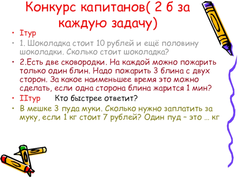Конкурс капитанов( 2 б за каждую задачу)Iтур1. Шоколадка стоит 10 рублей и ещё половину шоколадки. Сколько стоит