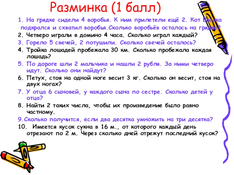 Разминка (1 балл)1. На грядке сидели 4 воробья. К ним прилетели ещё 2. Кот Васька подкрался и