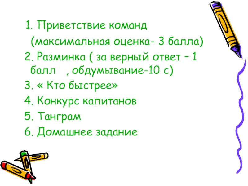1. Приветствие команд (максимальная оценка- 3 балла) 2. Разминка ( за верный ответ – 1 балл , обдумывание-10 с) 3. « Кто быстрее» 4. Конкурс капитанов 5.