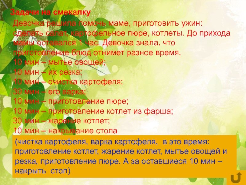 (чистка картофеля, варка картофеля, в это время: приготовление котлет, жарение котлет, мытье овощей и резка, приготовление пюре. А за оставшиеся 10 мин – накрыть стол)