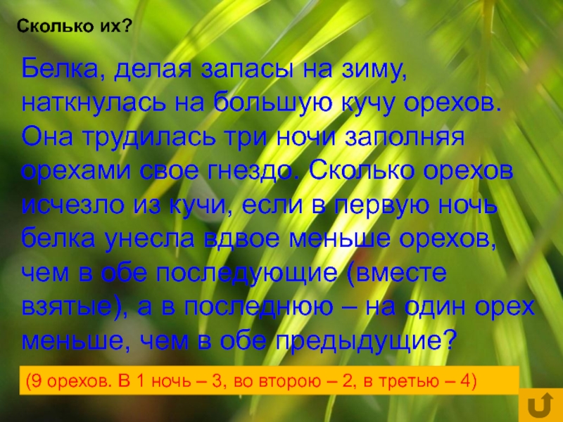 (9 орехов. В 1 ночь – 3, во второю – 2, в третью – 4)