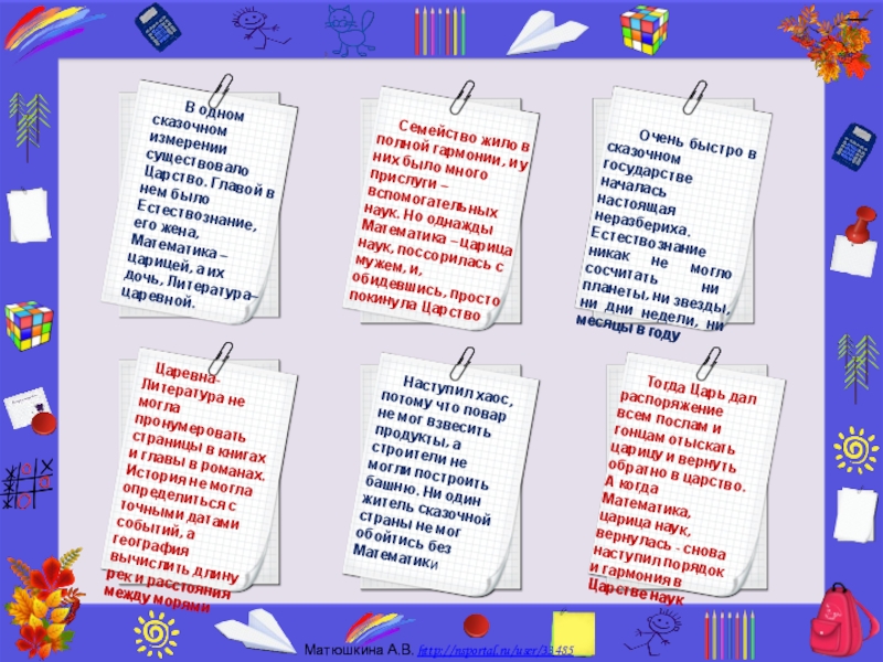 Семейство жило в полной гармонии, и у них было много прислуги – вспомогательных наук. Но однажды Математика – царица наук, поссорилась с мужем, и, обидевшись, просто покинула Царство