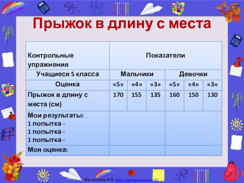 В приведены нормативы по прыжкам с места для учеников 11 класса