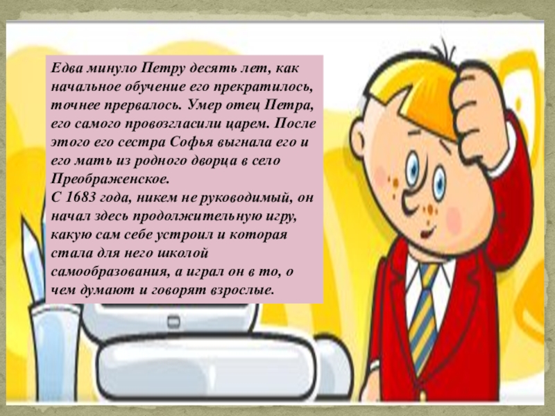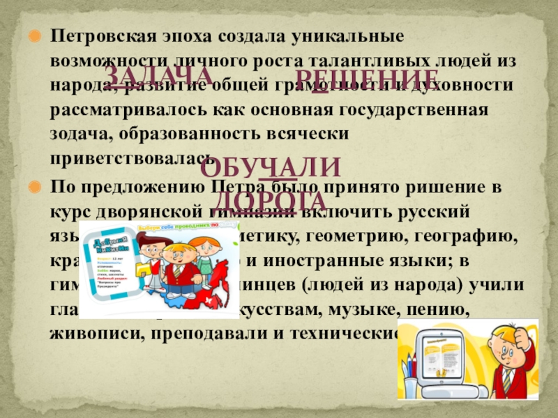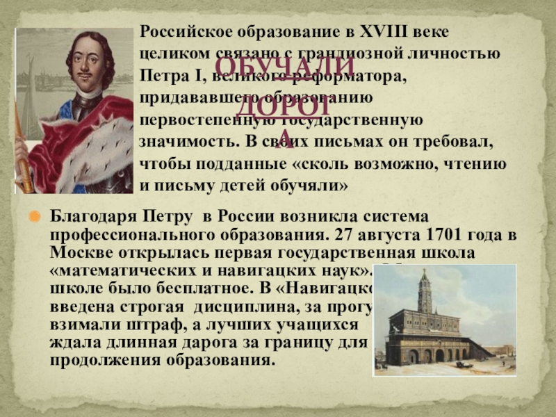 Российское образование в ХVIII веке целиком связано с грандиозной личностью Петра I, великого реформатора, придававшего образованию первостепенную государственную значимость. В своих письмах он требовал, чтобы подданные «сколь возможно, чтению и письму детей обучяли»